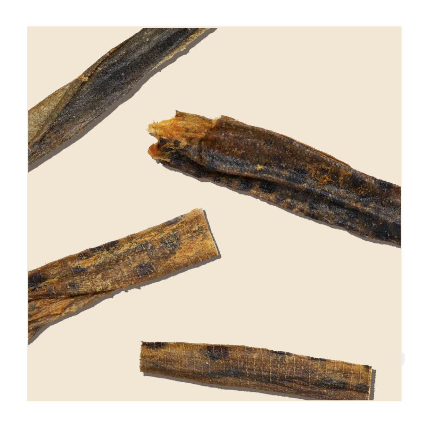 • Dog chew crafted with 100% Wolffish skins, wild-caught sustainably sourced from Europe and packed in the USA