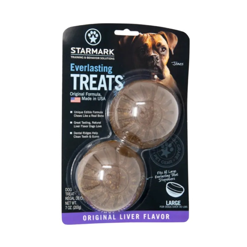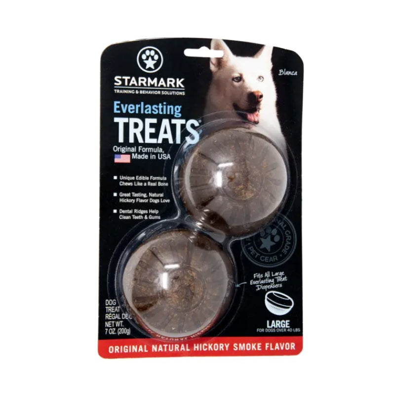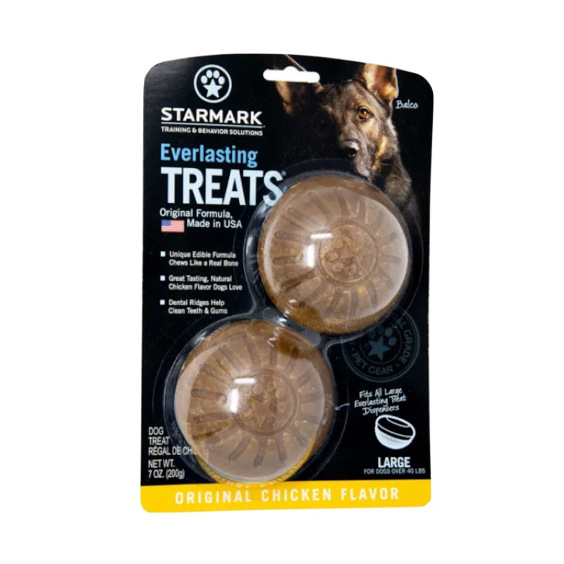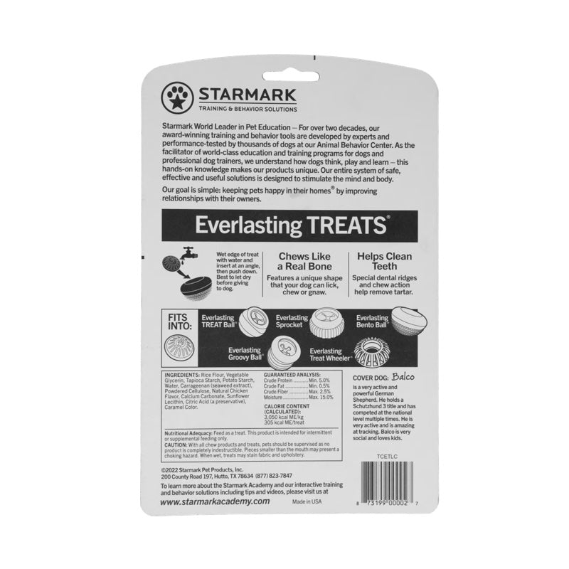 Everlasting Treats are long-lasting dental chews that are hard like a bone to help keep your dog's teeth clean. Starmark Treats are made from natural ingredients without plastics or polymers, and are edible and digestible with an irresistible taste. These treats can be eaten as a snack, or use them inside the Starmark Mental Stimulation toys to create hours of mental and physical stimulation.