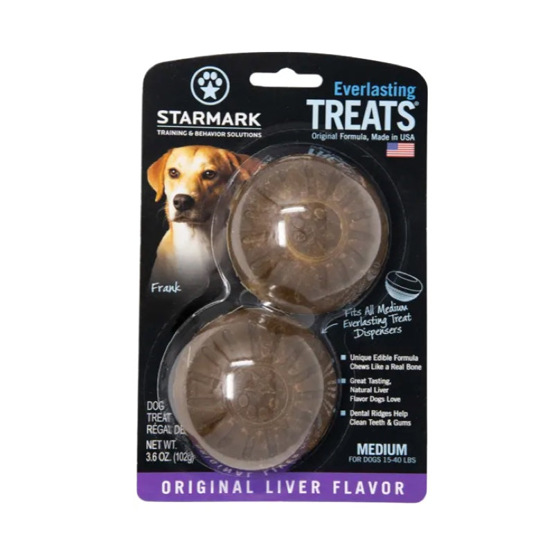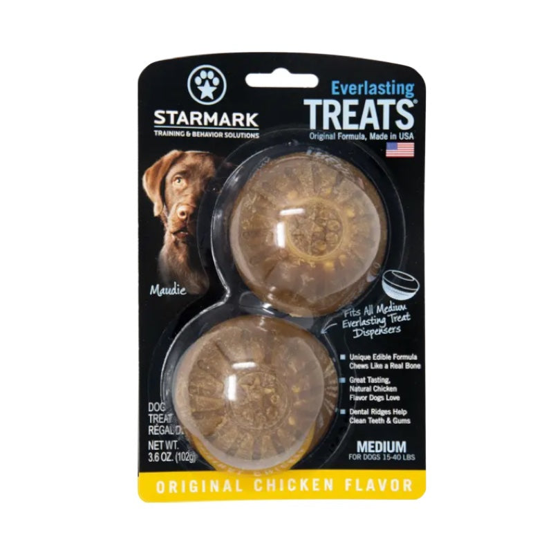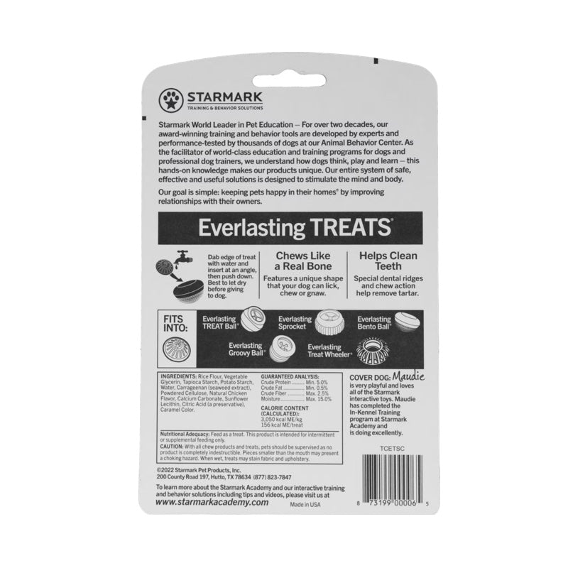 Everlasting Treats are long-lasting dental chews that are hard like a bone to help keep your dog's teeth clean. Starmark Treats are made from natural ingredients without plastics or polymers, and are edible and digestible with an irresistible taste. These treats can be eaten as a snack, or use them inside the Starmark Mental Stimulation toys to create hours of mental and physical stimulation.