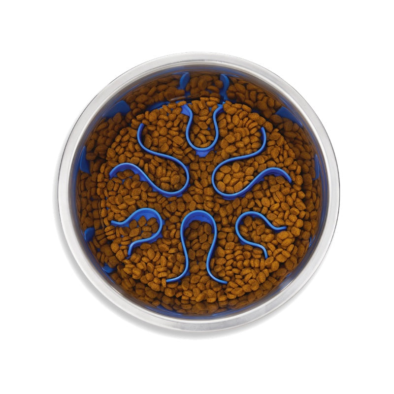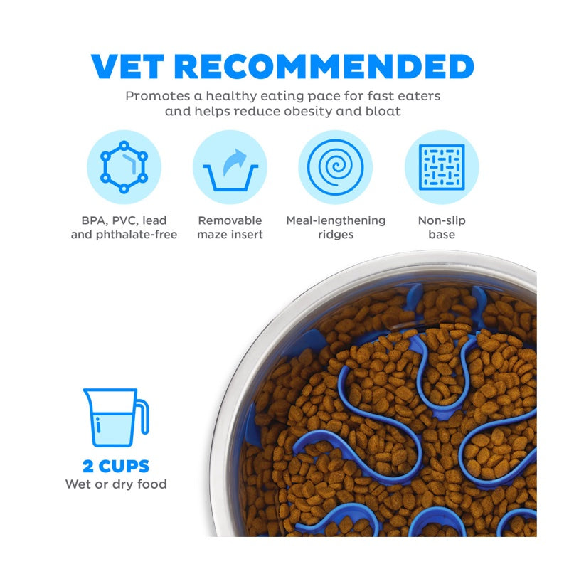 The Outward Hound Stainless Steel Fun Feeder Slo Bowl combines a stainless steel dog bowl with a meal-lengthening slow feeder insert to keep pups engaged for up to 10x longer at chow time. By creating a fun, healthy eating pace, slow feeders help reduce obesity and bloat and improve your dog's digestion for happier, healthier pups. Outward Hound's slow feeder dog bowls are non-slip to prevent sliding and spillage, BPA, PVC, lead, and phthalate free, and hold an entire meal no matter your dog's size. Go beyond the boring ol' dog bowl, and make mealtime more fun!