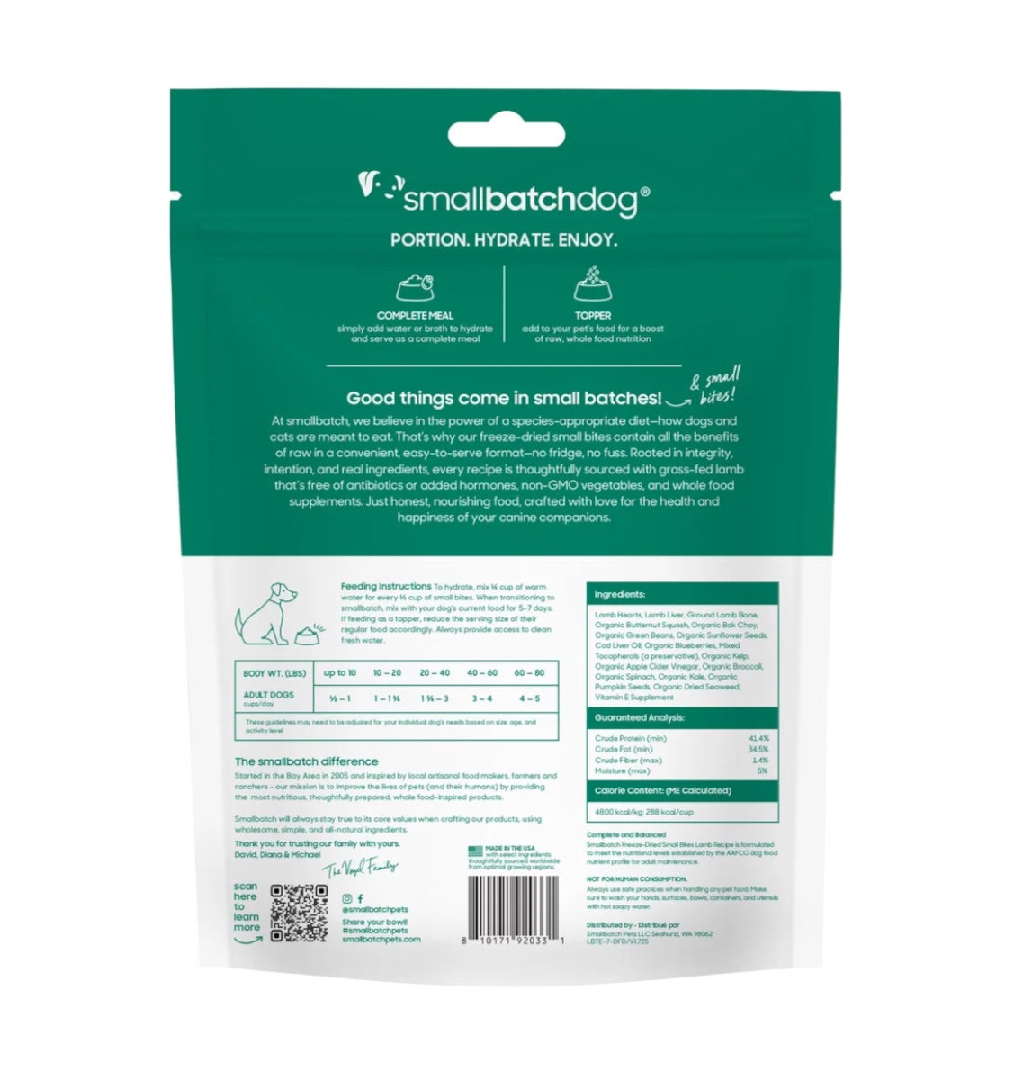 {"id":9891060777250,"title":"Smallbatch Small Bites Freeze-Dried Lamb Dog Food","handle":"smallbatch-small-bites-freeze-dried-lamb-dog-food","description":"\u003csection class=\"styles_infoGroupSection__bFZf8\"\u003e\n\u003csection class=\"styles_infoGroupSection__bFZf8\"\u003e\n\u003cp\u003e\u003cmeta charset=\"utf-8\"\u003e\u003cspan\u003eGive your pet a high-quality, protein-rich diet with Smallbatch Pets Freeze-Dried Lamb Small Bites Dog Food. Made with humanely raised lamb, nutrient-rich organs, and ground bone, this complete and balanced meal or topper is also packed with organic produce like carrots, sweet potatoes, zucchini, and blueberries. With 82% meat, organs, and bone, this freeze-dried raw recipe is free from synthetic ingredients, GMOs, fillers, and artificial additives, making it a wholesome and nutritious option for your furry friend.\u003c\/span\u003e\u003c\/p\u003e\n\u003c\/section\u003e\n\u003csection class=\"styles_infoGroupSection__bFZf8\"\u003e\u003c\/section\u003e\n\u003c\/section\u003e\n\u003csection class=\"styles_infoGroupSection__bFZf8\"\u003e\u003c\/section\u003e\n\u003cul\u003e\n\u003cli\u003e\n\u003cmeta charset=\"utf-8\"\u003e \u003cspan\u003eMade with 41.4% protein from humanely raised, single-source lamb, nutrient-rich organs, and ground bone for great canine health\u003c\/span\u003e\n\u003c\/li\u003e\n\u003cli\u003eEasy to rehydrate with water and serve as a whole meal, or serve dry as a meal topper or training treat\u003c\/li\u003e\n\u003cli\u003eContains organic produce like carrots, sweet potatoes, zucchini, and blueberries\u003c\/li\u003e\n\u003cli\u003eCrafted in the USA without grains for a quality product you can trust\u003c\/li\u003e\n\u003c\/ul\u003e\n\u003cp\u003e\u003cspan style=\"text-decoration: underline;\"\u003eIngredients\u003c\/span\u003e:\u003cbr\u003e\u003cmeta charset=\"utf-8\"\u003e\u003cspan\u003eLamb Hearts, Lamb Liver, Ground Lamb Bone, Organic Butternut Squash, Organic Bok Choy, Organic Green Beans, Organic Sunflower Seeds, Cod Liver Oil, Organic Blueberries, Mixed Tocopherols (a Preservative), Organic Kelp, Organic Apple Cider Vinegar, Organic Broccoli, Organic Spinach, Organic Kale, Organic Pumpkin Seeds, Organic Dried Seaweed, Vitamin E Supplement\u003c\/span\u003e\u003cbr\u003e\u003c\/p\u003e\n\u003cp\u003e\u003cspan style=\"text-decoration: underline;\"\u003eGuaranteed Analysis\u003c\/span\u003e:\u003cbr\u003eCrude Protein (min) 41.4%\u003cbr\u003eCrude Fat (min) 34.5%\u003cbr\u003eCrude Fiber (max) 1.4%\u003cbr\u003eMoisture (max) 5%\u003c\/p\u003e\n\u003cp\u003e\u003cspan style=\"text-decoration: underline;\"\u003eCaloric Content\u003c\/span\u003e:\u003cbr\u003e288 kcal\/ cup\u003c\/p\u003e","published_at":"2025-10-24T00:44:04-07:00","created_at":"2025-10-24T00:39:41-07:00","vendor":"Smallbatch","type":"Dog Food","tags":["Dog","Dog food","Dry Food","Food Toppers","Freeze Dried Food","Freeze Dried Treats","training treat"],"price":2299,"price_min":2299,"price_max":5999,"available":true,"price_varies":true,"compare_at_price":null,"compare_at_price_min":0,"compare_at_price_max":0,"compare_at_price_varies":false,"variants":[{"id":50463764021538,"title":"7oz","option1":"7oz","option2":null,"option3":null,"sku":"210000014091","requires_shipping":true,"taxable":true,"featured_image":null,"available":true,"name":"Smallbatch Small Bites Freeze-Dried Lamb Dog Food - 7oz","public_title":"7oz","options":["7oz"],"price":2299,"weight":198,"compare_at_price":null,"inventory_quantity":4,"inventory_management":"shopify","inventory_policy":"deny","barcode":"810171920331","requires_selling_plan":false,"selling_plan_allocations":[{"price_adjustments":[{"position":1,"price":2184}],"price":2184,"compare_at_price":2299,"per_delivery_price":2184,"selling_plan_id":9607119138,"selling_plan_group_id":"be5676770f7a2a402f39044871b9ae3b86c22e15"},{"price_adjustments":[{"position":1,"price":2184}],"price":2184,"compare_at_price":2299,"per_delivery_price":2184,"selling_plan_id":9607151906,"selling_plan_group_id":"be5676770f7a2a402f39044871b9ae3b86c22e15"},{"price_adjustments":[{"position":1,"price":2184}],"price":2184,"compare_at_price":2299,"per_delivery_price":2184,"selling_plan_id":9607184674,"selling_plan_group_id":"be5676770f7a2a402f39044871b9ae3b86c22e15"},{"price_adjustments":[{"position":1,"price":2184}],"price":2184,"compare_at_price":2299,"per_delivery_price":2184,"selling_plan_id":9607217442,"selling_plan_group_id":"be5676770f7a2a402f39044871b9ae3b86c22e15"},{"price_adjustments":[{"position":1,"price":2184}],"price":2184,"compare_at_price":2299,"per_delivery_price":2184,"selling_plan_id":9607250210,"selling_plan_group_id":"be5676770f7a2a402f39044871b9ae3b86c22e15"},{"price_adjustments":[{"position":1,"price":2184}],"price":2184,"compare_at_price":2299,"per_delivery_price":2184,"selling_plan_id":9607282978,"selling_plan_group_id":"be5676770f7a2a402f39044871b9ae3b86c22e15"},{"price_adjustments":[{"position":1,"price":2184}],"price":2184,"compare_at_price":2299,"per_delivery_price":2184,"selling_plan_id":9607315746,"selling_plan_group_id":"be5676770f7a2a402f39044871b9ae3b86c22e15"},{"price_adjustments":[{"position":1,"price":2184}],"price":2184,"compare_at_price":2299,"per_delivery_price":2184,"selling_plan_id":9607348514,"selling_plan_group_id":"be5676770f7a2a402f39044871b9ae3b86c22e15"},{"price_adjustments":[{"position":1,"price":2184}],"price":2184,"compare_at_price":2299,"per_delivery_price":2184,"selling_plan_id":9607381282,"selling_plan_group_id":"be5676770f7a2a402f39044871b9ae3b86c22e15"},{"price_adjustments":[{"position":1,"price":2184}],"price":2184,"compare_at_price":2299,"per_delivery_price":2184,"selling_plan_id":9607414050,"selling_plan_group_id":"be5676770f7a2a402f39044871b9ae3b86c22e15"},{"price_adjustments":[{"position":1,"price":2184}],"price":2184,"compare_at_price":2299,"per_delivery_price":2184,"selling_plan_id":9607446818,"selling_plan_group_id":"be5676770f7a2a402f39044871b9ae3b86c22e15"},{"price_adjustments":[{"position":1,