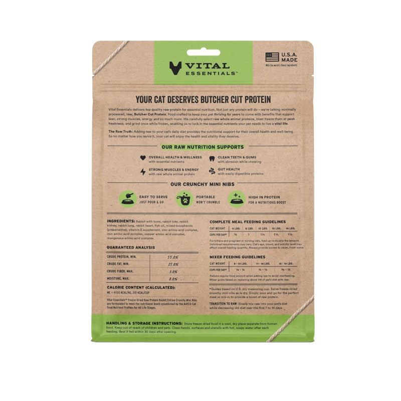 {"id":9887800262946,"title":"Vital Essentials Freeze-Dried Crunchy Nibs Rabbit Cat Food 12oz","handle":"vital-essentials-cat-rabbit-mini-nibs-12oz","description":"\u003cp\u003e\u003cmeta charset=\"utf-8\"\u003e\u003cspan\u003eWhen it comes to feeding your cat a raw diet, butcher cut protein provides superior benefits. And our freeze-dried raw mini nibs are the best way to pack tons of responsibly sourced and humanely harvested whole animal protein into every bite, making feeding a raw diet at mealtimes a breeze. The naturally occurring vitamins and minerals found in butcher cut protein builds strong muscles for more play, naturally supports digestive and oral health, and provides essential nutrients for cats to look and feel their best!\u003c\/span\u003e\u003c\/p\u003e\n\u003cul\u003e\n\u003cli\u003e\u003cspan\u003eWhole animal protein, including liver, kidney, lung \u0026amp; heart\u003c\/span\u003e\u003c\/li\u003e\n\u003cli\u003e\u003cspan\u003eGreat as a complete \u0026amp; balanced meal (no need to rehydrate) or combined with current food for an extra nutritional boost\u003c\/span\u003e\u003c\/li\u003e\n\u003cli\u003e\u003cspan\u003eBenefits of raw butcher cut protein include cleaner teeth from natural abrasion, immune \u0026amp; heart health support from zinc \u0026amp; taurine, improved digestive health from natural enzymes, and lean \u0026amp; strong muscles from essential amino acids\u003c\/span\u003e\u003c\/li\u003e\n\u003cli\u003e\u003cspan\u003eGrain \u0026amp; gluten free\u003c\/span\u003e\u003c\/li\u003e\n\u003c\/ul\u003e\n\u003cp\u003e\u003cspan\u003e\u003cspan style=\"text-decoration: underline;\"\u003eIngredients\u003c\/span\u003e:\u003cbr\u003e\u003cmeta charset=\"utf-8\"\u003eRabbit with bone, rabbit liver, rabbit kidney, rabbit lung, rabbit heart, fish oil, mixed tocopherols (preservative), vitamin E supplement, zinc amino acid complex, iron amino acid complex, copper amino acid complex, manganese amino acid complex\u003cbr\u003e\u003c\/span\u003e\u003c\/p\u003e\n\u003cp\u003e\u003cspan\u003e\u003cspan style=\"text-decoration: underline;\"\u003eGuaranteed Analysis\u003c\/span\u003e:\u003cbr\u003eCrude Protein (min) 55%\u003cbr\u003eCrude Fat (min) 15%\u003cbr\u003eCrude Fiber (max) 3%\u003cbr\u003eMoisture (max) 8%\u003c\/span\u003e\u003c\/p\u003e\n\u003cp\u003e\u003cspan\u003e\u003cspan style=\"text-decoration: underline;\"\u003eCaloric Content\u003c\/span\u003e:\u003cbr\u003e210 kcal\/ cup\u003c\/span\u003e\u003c\/p\u003e","published_at":"2025-11-24T23:57:30-08:00","created_at":"2025-10-22T18:46:53-07:00","vendor":"Vital Essentials","type":"Cat Food","tags":["Cat","cat dry food","Cat food","Dry Food cat","Food Toppers cat","Freeze Dried Food cat"],"price":4399,"price_min":4399,"price_max":4399,"available":true,"price_varies":false,"compare_at_price":null,"compare_at_price_min":0,"compare_at_price_max":0,"compare_at_price_varies":false,"variants":[{"id":50452627390754,"title":"Default Title","option1":"Default Title","option2":null,"option3":null,"sku":"210000010871","requires_shipping":true,"taxable":true,"featured_image":null,"available":true,"name":"Vital Essentials Freeze-Dried Crunchy Nibs Rabbit Cat Food 12oz","public_title":null,"options":["Default Title"],"price":4399,"weight":340,"compare_at_price":null,"inventory_quantity":2,"inventory_management":"shopify","inventory_policy":"deny","barcode":"840199690091","requires_selling_plan":false,"selling_plan_allocations":[{"price_adjustments":[{"position":1,"price":4179}],"price":4179,"compare_at_price":4399,"per_delivery_price":4179,"selling_plan_id":9614197026,"selling_plan_group_id":"be5676770f7a2a402f39044871b9ae3b86c22e15"},{"price_adjustments":[{"position":1,"price":4179}],"price":4179,"compare_at_price":4399,"per_delivery_price":4179,"selling_plan_id":9614229794,"selling_plan_group_id":"be5676770f7a2a402f39044871b9ae3b86c22e15"},{"price_adjustments":[{"position":1,"price":4179}],"price":4179,"compare_at_price":4399,"per_delivery_price":4179,"selling_plan_id":9614262562,"selling_plan_group_id":"be5676770f7a2a402f39044871b9ae3b86c22e15"},{"price_adjustments":[{"position":1,"price":4179}],"price":4179,"compare_at_price":4399,"per_delivery_price":4179,"selling_plan_id":9614295330,"selling_plan_group_id":"be5676770f7a2a402f39044871b9ae3b86c22e15"},{"price_adjustments":[{"position":1,"price":4179}],"price":4179,"compare_at_price":4399,"per_delivery_price":4179,"selling_plan_id":9614328098,"selling_plan_group_id":"be5676770f7a2a402f39044871b9ae3b86c22e15"},{"price_adjustments":[{"position":1,"price":4179}],"price":4179,"compare_at_price":4399,"per_delivery_price":4179,"selling_plan_id":9614360866,"selling_plan_group_id":"be5676770f7a2a402f39044871b9ae3b86c22e15"},{"price_adjustments":[{"position":1,"price":4179}],"price":4179,"compare_at_price":4399,"per_delivery_price":4179,"selling_plan_id":9614393634,"selling_plan_group_id":"be5676770f7a2a402f39044871b9ae3b86c22e15"},{"price_adjustments":[{"position":1,"price":4179}],"price":4179,"compare_at_price":4399,"per_delivery_price":4179,"selling_plan_id":9614426402,"selling_plan_group_id":"be5676770f7a2a402f39044871b9ae3b86c22e15"},{"price_adjustments":[{"position":1,"price":4179}],"price":4179,"compare_at_price":4399,"per_delivery_price":4179,"selling_plan_id":9614459170,"selling_plan_group_id":"be5676770f7a2a402f39044871b9ae3b86c22e15"},{"price_adjustments":[{"position":1,"price":4179}],"price":4179,"compare_at_price":4399,"per_delivery_price":4179,"selling_plan_id":9614491938,"selling_plan_group_id":"be5676770f7a2a402f39044871b9ae3b86c22e15"},{"price_adjustments":[{"position":1,"price":4179}],"price":4179,"compare_at_price":4399,"per_delivery_price":4179,"selling_plan_id":9614524706,"selling_plan_group_id":"be5676770f7a2a402f39044871b9ae3b86c22e15"},{"price_adjustments":[{"position":1,"price":4179}],"price":4179,"compare_at_price":4399,"per_delivery_price":4179,"selling_plan_id":9614557474,"selling_plan_group_id":"be5676770f7a2a402f39044871b9ae3b86c22e15"},{"price_adj