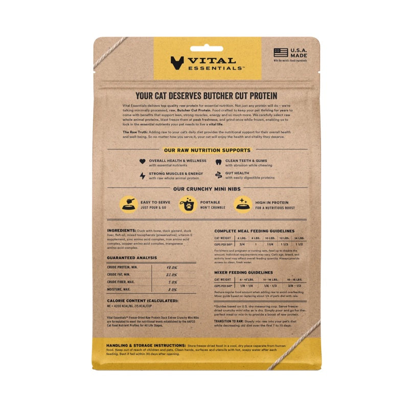 {"id":9951716704546,"title":"Vital Essentials Freeze-Dried Crunchy Nibs Duck Cat Food 12oz","handle":"vital-essentials-freeze-dried-crunchy-nibs-duck-cat-food-12oz","description":"\u003cp\u003e\u003cmeta charset=\"utf-8\"\u003e\u003cspan\u003eWhen it comes to feeding your cat a raw diet, butcher cut protein provides superior benefits. And our freeze-dried raw mini nibs are the best way to pack tons of responsibly sourced and humanely harvested whole animal protein into every bite, making feeding a raw diet at mealtimes a breeze. The naturally occurring vitamins and minerals found in butcher cut protein builds strong muscles for more play, naturally supports digestive and oral health, and provides essential nutrients for cats to look and feel their best!\u003c\/span\u003e\u003c\/p\u003e\n\u003cul\u003e\n\u003cli\u003e\u003cspan\u003eWhole animal protein, including gizzard \u0026amp; liver\u003c\/span\u003e\u003c\/li\u003e\n\u003cli\u003e\u003cspan\u003eGreat as a complete \u0026amp; balanced meal (no need to rehydrate) or combined with current food for an extra nutritional boost\u003c\/span\u003e\u003c\/li\u003e\n\u003cli\u003e\u003cspan\u003eBenefits of raw butcher cut protein include cleaner teeth from natural abrasion, immune \u0026amp; heart health support from zinc \u0026amp; taurine, improved digestive health from natural enzymes, and lean \u0026amp; strong muscles from essential amino acids\u003c\/span\u003e\u003c\/li\u003e\n\u003cli\u003e\u003cspan\u003eGrain \u0026amp; gluten free\u003c\/span\u003e\u003c\/li\u003e\n\u003c\/ul\u003e\n\u003cp\u003e\u003cspan\u003e\u003cspan style=\"text-decoration: underline;\"\u003eIngredients\u003c\/span\u003e:\u003cbr\u003e\u003cmeta charset=\"utf-8\"\u003eDuck with bone, duck gizzard, duck liver, fish oil, mixed tocopherols (preservative), vitamin E supplement, zinc amino acid complex, iron amino acid complex, copper amino acid complex, manganese amino acid complex\u003cbr\u003e\u003c\/span\u003e\u003c\/p\u003e\n\u003cp\u003e\u003cspan\u003e\u003cspan style=\"text-decoration: underline;\"\u003eGuaranteed Analysis\u003c\/span\u003e:\u003cbr\u003eCrude Protein (min) 48%\u003cbr\u003eCrude Fat (min) 21%\u003cbr\u003eCrude Fiber (max) 5%\u003cbr\u003eMoisture (max) 8%\u003c\/span\u003e\u003c\/p\u003e\n\u003cp\u003e\u003cspan\u003e\u003cspan style=\"text-decoration: underline;\"\u003eCaloric Content\u003c\/span\u003e:\u003cbr\u003e215 kcal\/ cup\u003c\/span\u003e\u003c\/p\u003e","published_at":"2025-11-25T00:04:59-08:00","created_at":"2025-11-25T00:01:47-08:00","vendor":"Vital Essentials","type":"Cat Food","tags":["Cat","cat dry food","Cat food","Dry Food cat","Food Toppers cat","Freeze Dried Food cat"],"price":3499,"price_min":3499,"price_max":3499,"available":true,"price_varies":false,"compare_at_price":null,"compare_at_price_min":0,"compare_at_price_max":0,"compare_at_price_varies":false,"variants":[{"id":50625101594914,"title":"Default Title","option1":"Default Title","option2":null,"option3":null,"sku":"210000011050","requires_shipping":true,"taxable":true,"featured_image":null,"available":true,"name":"Vital Essentials Freeze-Dried Crunchy Nibs Duck Cat Food 12oz","public_title":null,"options":["Default Title"],"price":3499,"weight":340,"compare_at_price":null,"inventory_quantity":1,"inventory_management":"shopify","inventory_policy":"deny","barcode":"840199690053","requires_selling_plan":false,"selling_plan_allocations":[{"price_adjustments":[{"position":1,"price":3324}],"price":3324,"compare_at_price":3499,"per_delivery_price":3324,"selling_plan_id":9614197026,"selling_plan_group_id":"be5676770f7a2a402f39044871b9ae3b86c22e15"},{"price_adjustments":[{"position":1,"price":3324}],"price":3324,"compare_at_price":3499,"per_delivery_price":3324,"selling_plan_id":9614229794,"selling_plan_group_id":"be5676770f7a2a402f39044871b9ae3b86c22e15"},{"price_adjustments":[{"position":1,"price":3324}],"price":3324,"compare_at_price":3499,"per_delivery_price":3324,"selling_plan_id":9614262562,"selling_plan_group_id":"be5676770f7a2a402f39044871b9ae3b86c22e15"},{"price_adjustments":[{"position":1,"price":3324}],"price":3324,"compare_at_price":3499,"per_delivery_price":3324,"selling_plan_id":9614295330,"selling_plan_group_id":"be5676770f7a2a402f39044871b9ae3b86c22e15"},{"price_adjustments":[{"position":1,"price":3324}],"price":3324,"compare_at_price":3499,"per_delivery_price":3324,"selling_plan_id":9614328098,"selling_plan_group_id":"be5676770f7a2a402f39044871b9ae3b86c22e15"},{"price_adjustments":[{"position":1,"price":3324}],"price":3324,"compare_at_price":3499,"per_delivery_price":3324,"selling_plan_id":9614360866,"selling_plan_group_id":"be5676770f7a2a402f39044871b9ae3b86c22e15"},{"price_adjustments":[{"position":1,"price":3324}],"price":3324,"compare_at_price":3499,"per_delivery_price":3324,"selling_plan_id":9614393634,"selling_plan_group_id":"be5676770f7a2a402f39044871b9ae3b86c22e15"},{"price_adjustments":[{"position":1,"price":3324}],"price":3324,"compare_at_price":3499,"per_delivery_price":3324,"selling_plan_id":9614426402,"selling_plan_group_id":"be5676770f7a2a402f39044871b9ae3b86c22e15"},{"price_adjustments":[{"position":1,"price":3324}],"price":3324,"compare_at_price":3499,"per_delivery_price":3324,"selling_plan_id":9614459170,"selling_plan_group_id":"be5676770f7a2a402f39044871b9ae3b86c22e15"},{"price_adjustments":[{"position":1,"price":3324}],"price":3324,"compare_at_price":3499,"per_delivery_price":3324,"selling_plan_id":9614491938,"selling_plan_group_id":"be5676770f7a2a402f39044871b9ae3b86c22e15"},{"price_adjustments":[{"position":1,"price":3324}],"price":3324,"compare_at_price":3499,"per_delivery_price":3324,"selling_plan_id":9614524706,"selling_plan_group_id":"be5676770f7a2a402f39044871b9ae3b86c22e15"},{"price_adjustments":[{"position":1,"price":3324}],"price":3324,"compare_at_price":3499,"per_delivery_price":3324,"selling_plan_id":9614557474,"selling_plan_group_id":"be5676770f7a2a402f39044871b9ae3b86c22e15"},{"price_adjustments":[{"position":1,"pri