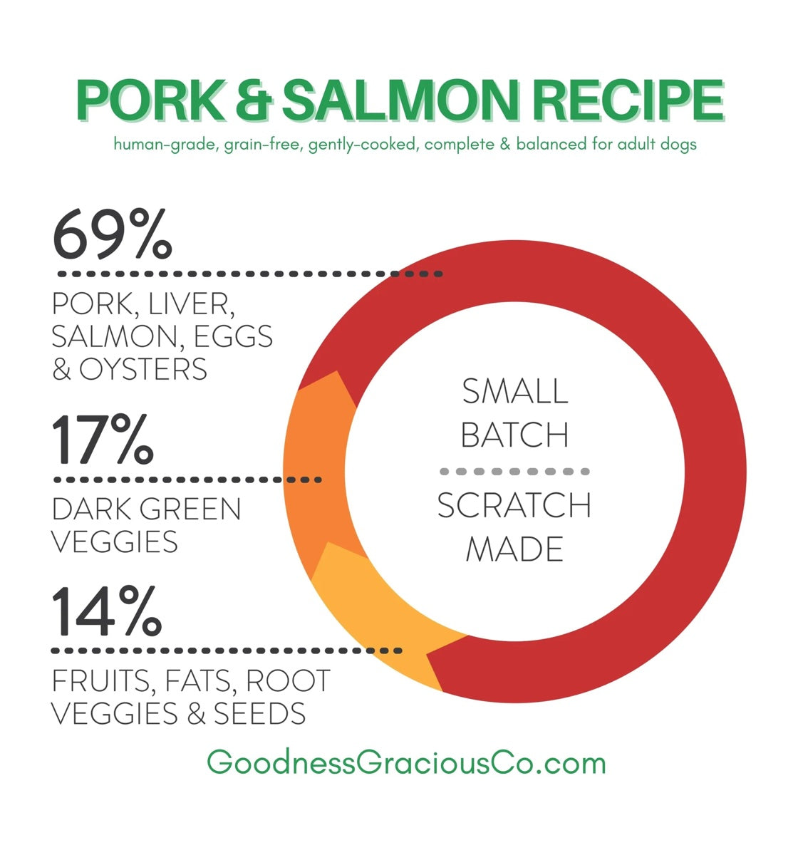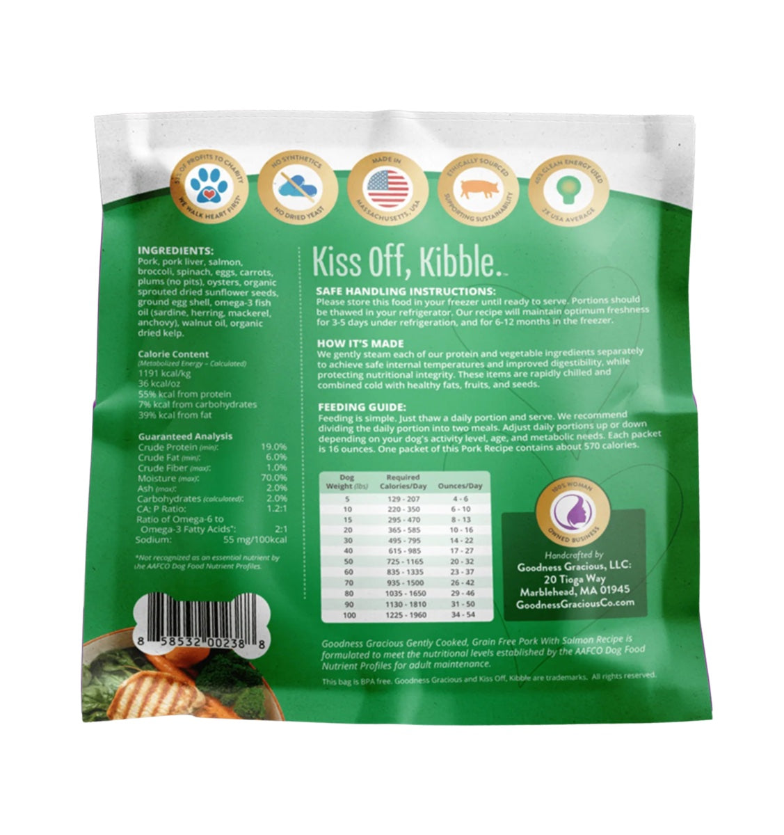 Enjoy easy-to-serve pouches of lean and flavorful pork and pork liver with wild Alaskan salmon. Goodness Gracious gently tosses their proteins with vibrant greens like kale and broccoli, juicy sweet plums, carrots and eggs. They add a walnut oil drizzle, a sprinkling of ground sunflower seeds and serve it accompanied by some of the sea's secret nutritional treasures like local oysters, fish oil and a teeny tiny touch of kelp. The result is a complete and balanced meal fit for kings and canines. It's free of distasteful powdered vitamin and mineral supplements. And it's one of the reasons why pet parents say: "My dog eats better than me."