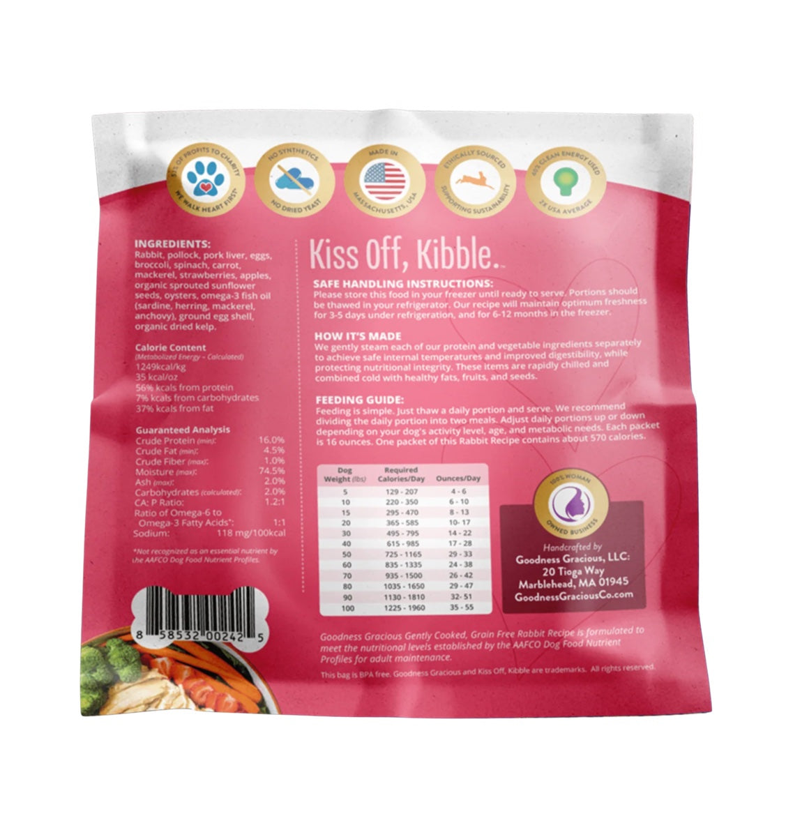 {"id":10035764461858,"title":"Goodness Gracious Gently Cooked Rabbit Recipe for Dogs 16oz","handle":"goodness-gracious-gently-cooked-rabbit-recipe-for-dogs-16oz","description":"\u003cp\u003e\u003cspan\u003eEnjoy easy-to-serve pouches of Goodness Gracious' complete and balanced, gently-cooked Rabbit Recipe. \u003cmeta charset=\"utf-8\"\u003eSlowly steamed rabbit pairs with wild-caught pollock, clean and bright greens, carrots, apples and strawberries in a luscious and sustainable harvest from Mother Nature. Always non-GMO and human grade, it’s how dogs would scratch-cook dinner if they had opposable thumbs.\u003c\/span\u003e\u003c\/p\u003e\n\u003cul\u003e\n\u003cli\u003eHolistic veterinarian designed, high-protein, low starch\u003c\/li\u003e\n\u003cli\u003eHuman grade, gently cooked fresh food for dogs \u003c\/li\u003e\n\u003cli\u003eMade from scratch in small batches\u003c\/li\u003e\n\u003cli\u003eGrain free, low glycemic load (0.68), and excellent Omega-6: Omega-3 ratio of (1:1)\u003c\/li\u003e\n\u003c\/ul\u003e\n\u003cp\u003e\u003cspan style=\"text-decoration: underline;\"\u003eIngredients\u003c\/span\u003e:\u003cbr\u003e\u003cmeta charset=\"utf-8\"\u003e\u003cspan\u003eRabbit, pollock, pork liver, eggs, broccoli, spinach, carrot, mackerel, strawberries, apples, organic sprouted sunflower seeds, oysters, omega-3 fish oil (sardine, herring, mackerel, anchovy), ground eggshell, organic dried kelp\u003c\/span\u003e\u003cbr\u003e\u003c\/p\u003e\n\u003cp\u003e\u003cspan\u003e\u003cspan style=\"text-decoration: underline;\"\u003eGuaranteed Analysis\u003c\/span\u003e:\u003cbr\u003eProtein (max) 63%\u003cbr\u003eFat (max) 18% \u003cbr\u003e\u003c\/span\u003e\u003cspan\u003eCarbohydrates 7%\u003cbr\u003eFiber 4%\u003cbr\u003e\u003c\/span\u003e\u003c\/p\u003e\n\u003cp\u003e\u003cspan\u003e\u003cspan style=\"text-decoration: underline;\"\u003eCaloric Content\u003c\/span\u003e:\u003cbr\u003e35 kcal\/ ounce\u003c\/span\u003e\u003c\/p\u003e","published_at":"2026-02-27T15:41:05-08:00","created_at":"2026-02-27T15:33:44-08:00","vendor":"Goodness Gracious","type":"Frozen Dog Food","tags":["cooked","Dog","Dog food","freezer","Frozen \u0026 Raw Food","lightly cooked","Pickup Only"],"price":1699,"price_min":1699,"price_max":1699,"available":false,"price_varies":false,"compare_at_price":null,"compare_at_price_min":0,"compare_at_price_max":0,"compare_at_price_varies":false,"variants":[{"id":51381657895202,"title":"Default Title","option1":"Default Title","option2":null,"option3":null,"sku":"210000014383","requires_shipping":true,"taxable":true,"featured_image":null,"available":false,"name":"Goodness Gracious Gently Cooked Rabbit Recipe for Dogs 16oz","public_title":null,"options":["Default Title"],"price":1699,"weight":454,"compare_at_price":null,"inventory_quantity":0,"inventory_management":"shopify","inventory_policy":"deny","barcode":"858532002425","requires_selling_plan":false,"selling_plan_allocations":[{"price_adjustments":[{"position":1,"price":1614}],"price":1614,"compare_at_price":1699,"per_delivery_price":1614,"selling_plan_id":9734979874,"selling_plan_group_id":"be5676770f7a2a402f39044871b9ae3b86c22e15"},{"price_adjustments":[{"position":1,"price":1614}],"price":1614,"compare_at_price":1699,"per_delivery_price":1614,"selling_plan_id":9735012642,"selling_plan_group_id":"be5676770f7a2a402f39044871b9ae3b86c22e15"},{"price_adjustments":[{"position":1,"price":1614}],"price":1614,"compare_at_price":1699,"per_delivery_price":1614,"selling_plan_id":9735045410,"selling_plan_group_id":"be5676770f7a2a402f39044871b9ae3b86c22e15"},{"price_adjustments":[{"position":1,"price":1614}],"price":1614,"compare_at_price":1699,"per_delivery_price":1614,"selling_plan_id":9735078178,"selling_plan_group_id":"be5676770f7a2a402f39044871b9ae3b86c22e15"},{"price_adjustments":[{"position":1,"price":1614}],"price":1614,"compare_at_price":1699,"per_delivery_price":1614,"selling_plan_id":9735110946,"selling_plan_group_id":"be5676770f7a2a402f39044871b9ae3b86c22e15"},{"price_adjustments":[{"position":1,"price":1614}],"price":1614,"compare_at_price":1699,"per_delivery_price":1614,"selling_plan_id":9735143714,"selling_plan_group_id":"be5676770f7a2a402f39044871b9ae3b86c22e15"},{"price_adjustments":[{"position":1,"price":1614}],"price":1614,"compare_at_price":1699,"per_delivery_price":1614,"selling_plan_id":9735176482,"selling_plan_group_id":"be5676770f7a2a402f39044871b9ae3b86c22e15"},{"price_adjustments":[{"position":1,"price":1614}],"price":1614,"compare_at_price":1699,"per_delivery_price":1614,"selling_plan_id":9735209250,"selling_plan_group_id":"be5676770f7a2a402f39044871b9ae3b86c22e15"},{"price_adjustments":[{"position":1,"price":1614}],"price":1614,"compare_at_price":1699,"per_delivery_price":1614,"selling_plan_id":9735242018,"selling_plan_group_id":"be5676770f7a2a402f39044871b9ae3b86c22e15"},{"price_adjustments":[{"position":1,"price":1614}],"price":1614,"compare_at_price":1699,"per_delivery_price":1614,"selling_plan_id":9735274786,"selling_plan_group_id":"be5676770f7a2a402f39044871b9ae3b86c22e15"},{"price_adjustments":[{"position":1,"price":1614}],"price":1614,"compare_at_price":1699,"per_delivery_price":1614,"selling_plan_id":9735307554,"selling_plan_group_id":"be5676770f7a2a402f39044871b9ae3b86c22e15"},{"price_adjustments":[{"position":1,"price":1614}],"price":1614,"compare_at_price":1699,"per_delivery_price":1614,"selling_plan_id":9735340322,"selling_plan_group_id":"be5676770f7a2a402f39044871b9ae3b86c22e15"},{"price_adjustments":[{"position":1,"price":1614}],"price":1614,"compare_at_price":1699,"per_delivery_price":1614,"selling_plan_id":9735373090,"selling_plan_group_id":"be5676770f7a2a402f39044871b9ae3b86c22e15"}]}],"images":["\/\/furlys.com\/cdn\/shop\/files\/GoodnessGracious_Frozen_Rabbit_ad510a06-c5b8-488e-9ad5-4409dcb1c69c.jpg?v=1772235595","\/\/furlys.com\/cdn\/shop\/files\/GoodnessGracious_Frozen_Rabbit1.jpg?v=1772235655","\/\/furlys.com\/cdn\/shop\/files\/GoodnessGracious_Frozen_Rabbit2.jpg?v=1772235655","\/\/furly