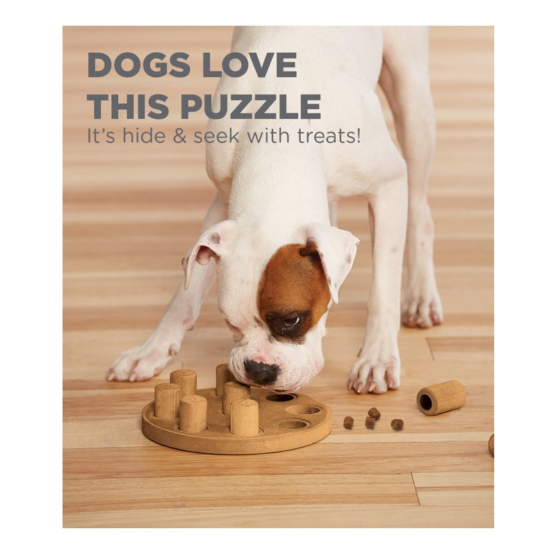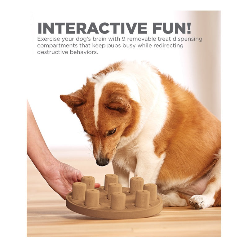• Durable Construction: A composite blend of plastic and wood make this interactive dog puzzle appealing to dogs while also longer-lasting than wood or plastic alone