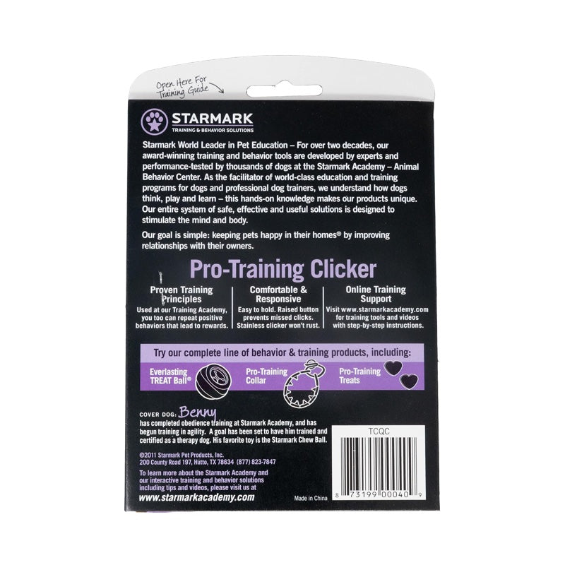 The Starmark Pro Training Clicker is an ergonomically designed, handheld tool for positive reinforcement dog training, featuring a raised button to prevent missed clicks and a durable stainless-steel clicker that won't rust, helping mark precise moments of desired behavior for faster learning.